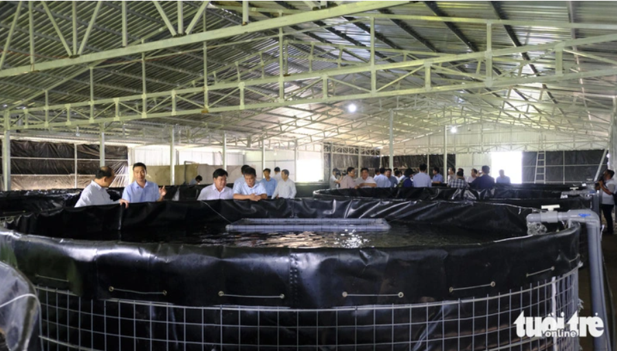 Ông Lê Quốc Phong - bí thư Tỉnh ủy Đồng Tháp (bìa trái) - tham quan mô hình nuôi cá chình công nghệ tuần hoàn nguồn nước sạch 100% tại huyện Hồng Ngự - Ảnh: ĐẶNG TUYẾT