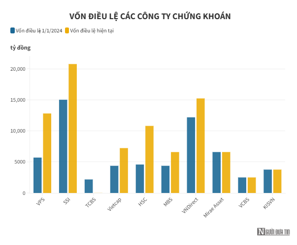 Trong đó, SSI trở thành công ty chứng khoán đầu tiên có vốn điều lệ vượt 20.000 tỷ đồng, sánh ngang một ngân hàng tầm trung. TCBS, sau đợt IPO lịch sử, nâng vốn lên 23.133 tỷ đồng, huy động thành công 10.817 tỷ đồng – kỷ lục của ngành chứng khoán Việt Nam.