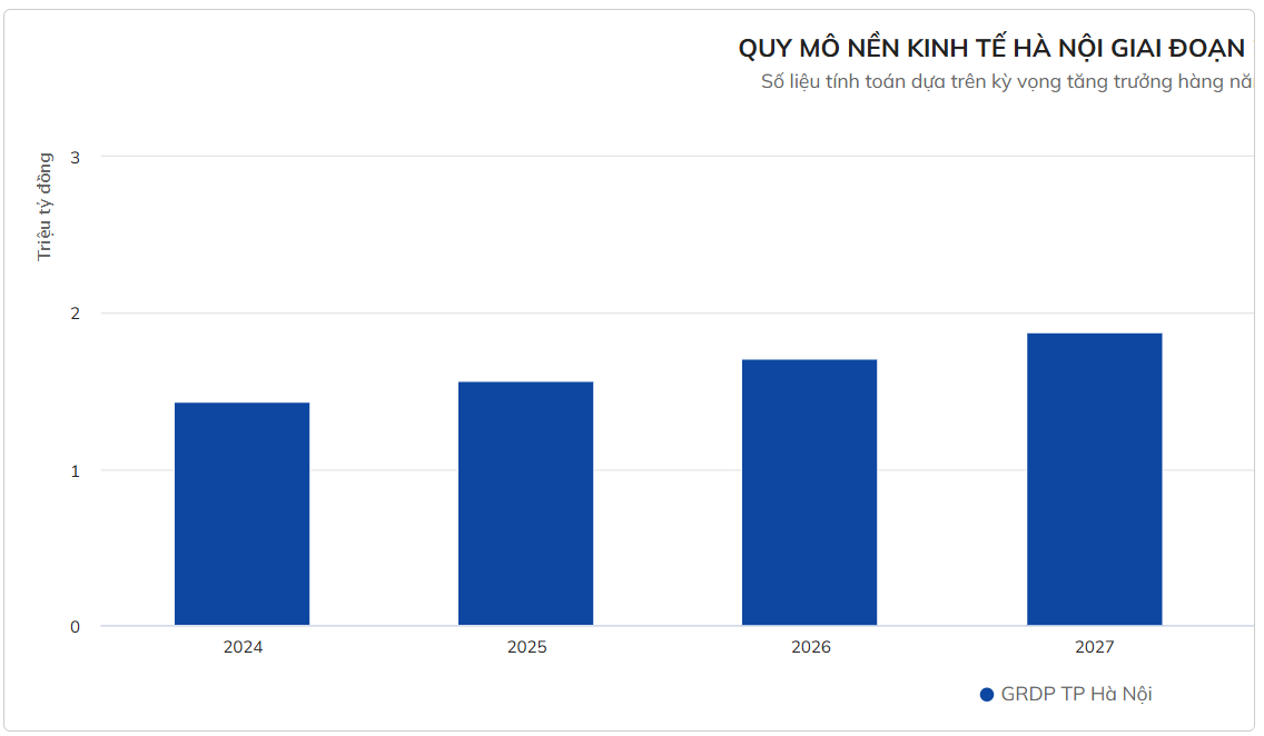 Trong giai đoạn 2021-2030, tốc độ tăng trưởng tổng sản phẩm trên địa bàn (GRDP) bình quân của Hà Nội dự kiến khoảng 8,5-9,5%/năm. Đến cuối năm 2024, quy mô nền kinh tế Thủ đô đạt khoảng 1,43 triệu tỷ đồng, nếu đạt mức tăng trưởng bình quân 9,5% mỗi năm, GRDP của Hà Nội sẽ tăng lên gần 2,47 triệu tỷ đồng vào năm 2030, tương ứng tăng 72% sau nửa thập kỳ.