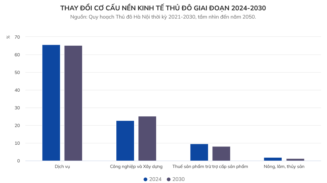 Về cơ cấu GRDP, nền kinh tế Thủ đô trong 5 năm tới dự kiến dịch chuyển theo hướng giảm tỷ trọng khu vực nông, lâm, thủy sản từ 1,96% hiện tại xuống 1,3% và thuế sản phẩm trừ trợ cấp sản phẩm từ 9,65% xuống 8,2%, trong khi đóng góp khu vực công nghiệp - xây dựng sẽ tăng vọt từ 22,79% hiện nay lên 25,3% vào năm 2030. Chiếm tỷ trọng cao nhất dự kiến vẫn là khu vực dịch vụ với khoảng 65,2% (cuối năm 2024 là 65,6%).