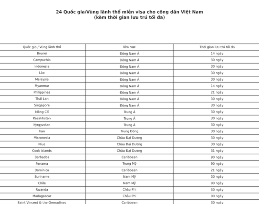 Để chuyến đi suôn sẻ, du khách nên tra cứu thông tin mới nhất từ trang web chính thức của cơ quan ngoại giao nước đến trước khi khởi hành. Dưới đây là bảng 24 quốc gia và vùng lãnh thổ miễn visa hoàn toàn cho công dân Việt Nam kèm thời gian lưu trú tối đa - theo thông tin từ nền tảng xử lý thị thực trực tuyến Atlys.
