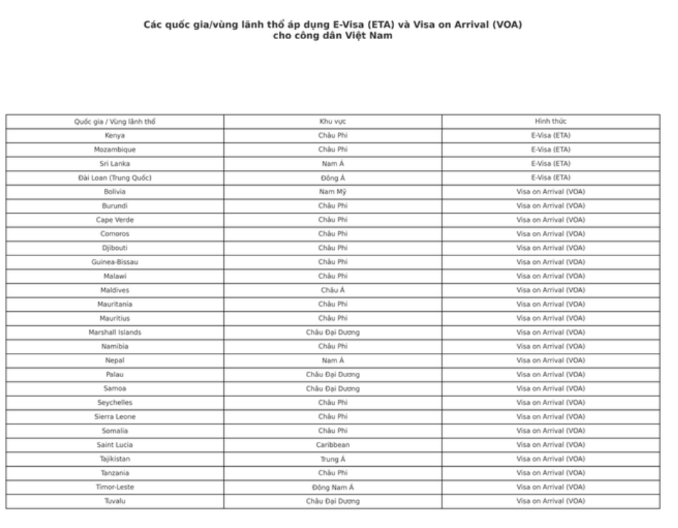 Bên cạnh những quốc gia và vùng lãnh thổ miễn visa hoàn toàn, công dân Việt Nam vẫn có thể dễ dàng đặt chân đến nhiều điểm đến hấp dẫn khác thông qua hai hình thức đơn giản: Xin visa điện tử (e-visa hoặc ETA) và visa-on-arrival (VOA) – visa được cấp ngay khi đến sân bay hoặc cửa khẩu mà không cần xin trước tại Đại sứ quán.
