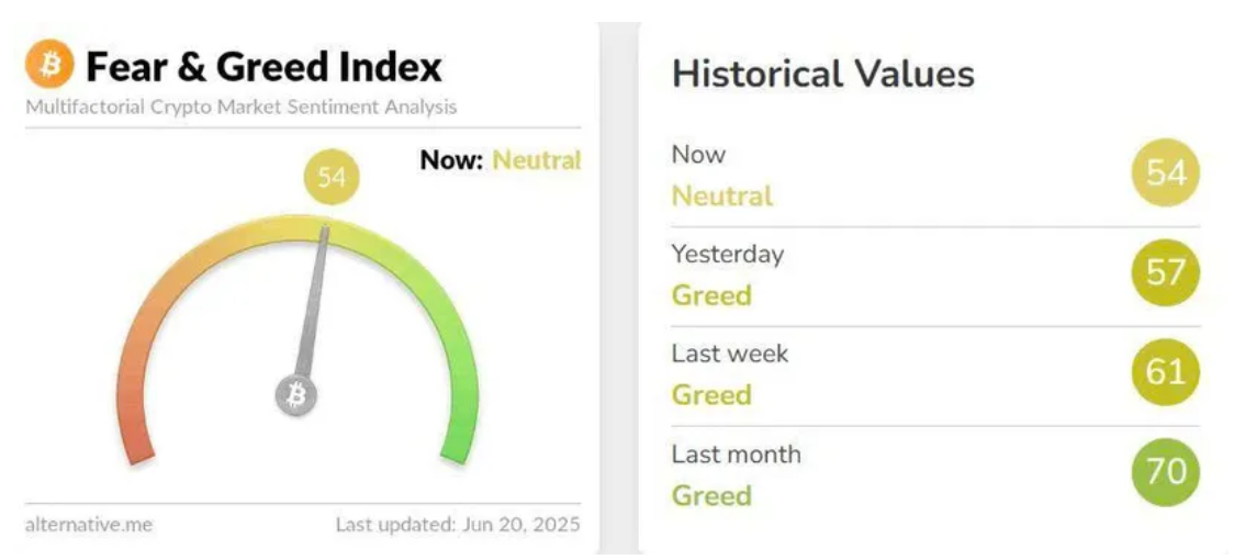 Trong khi đó, Chỉ số sợ hãi và tham lam đã giảm xuống mức 54/100 vào thứ Sáu (20-6), đưa thái độ của thị trường từ “tham lam” xuống “trung lập”.